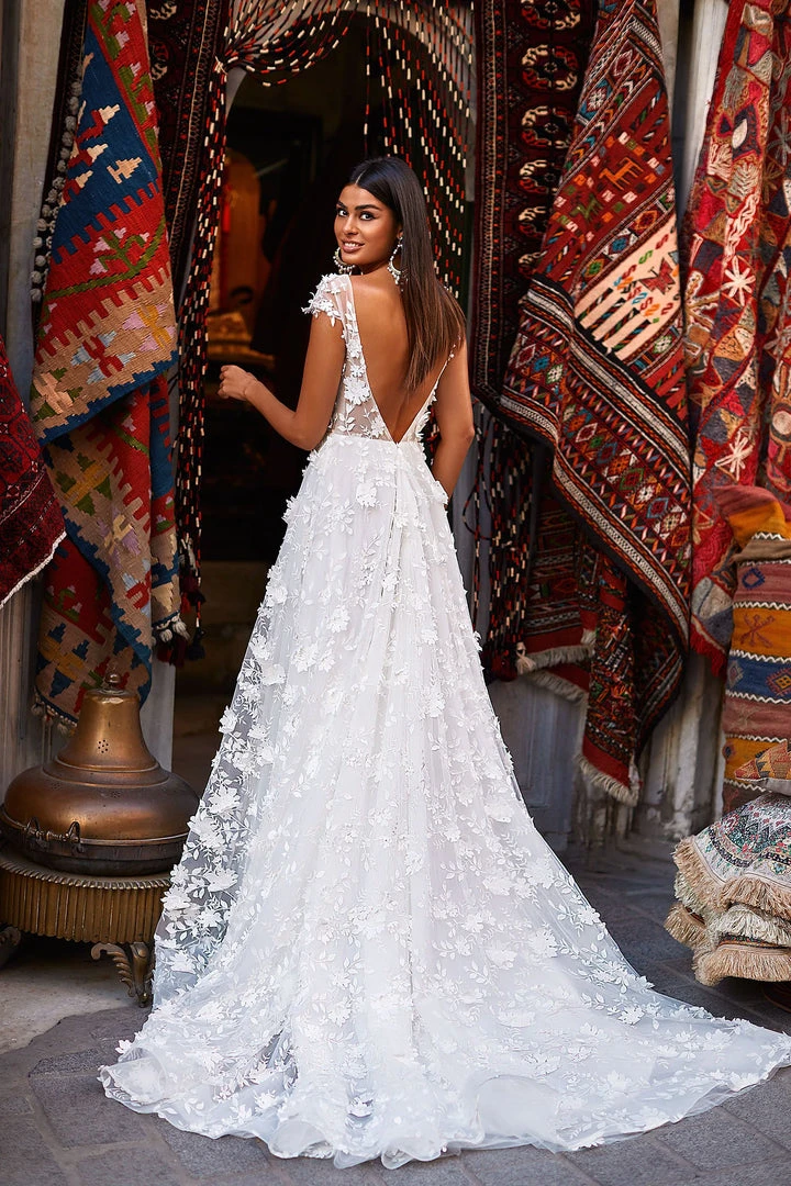 The Derya Gown brings a fashion-forward statement to your bridal look. Created with a sheer bodice, deep v-neckline, cap sleeves, and adorned with delicate 3D floral details, you’ll be sure to make a statement.