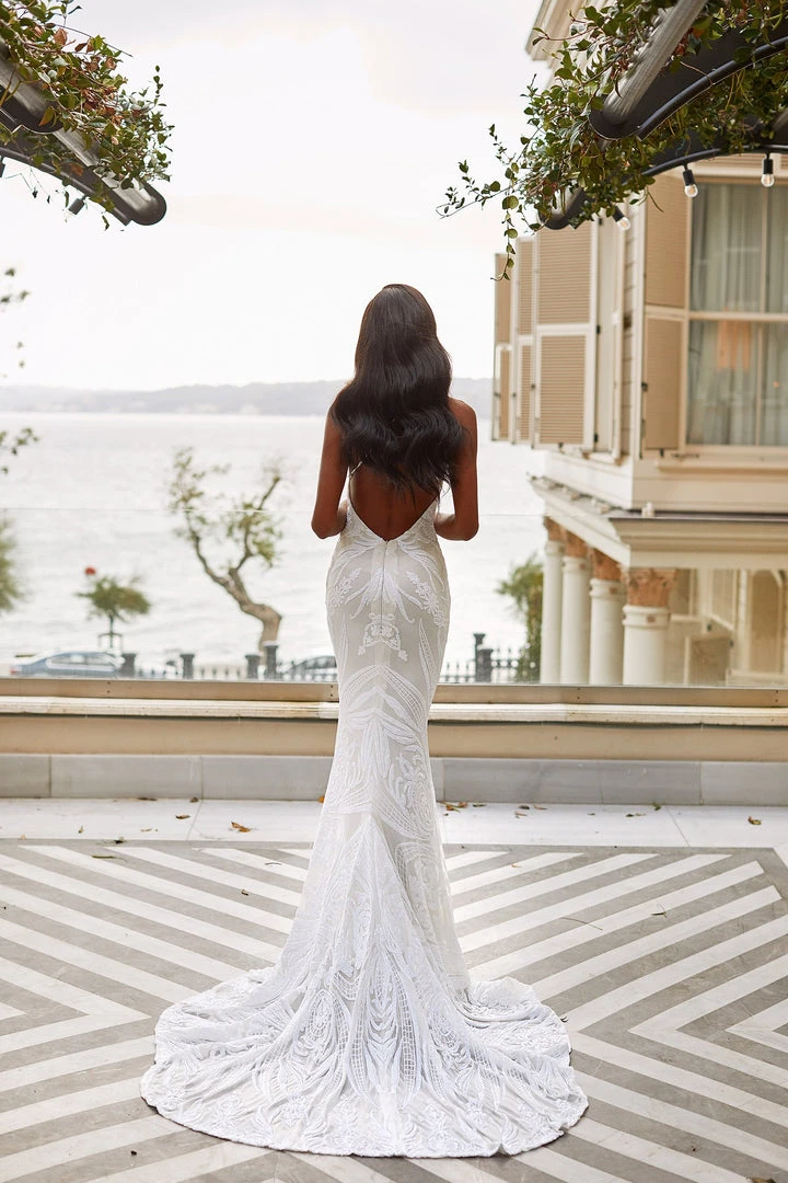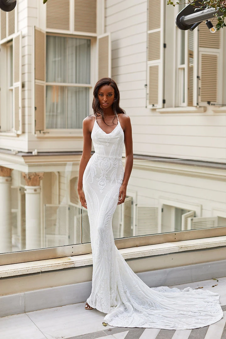 Glamorous & show-stopping, the Alayna Gown is made from our signature sequin patterned fabric in a classic white tone. This gown features a cowl neckline, fitted mermaid silhouette with a train & adjustable criss-cross back straps.Â