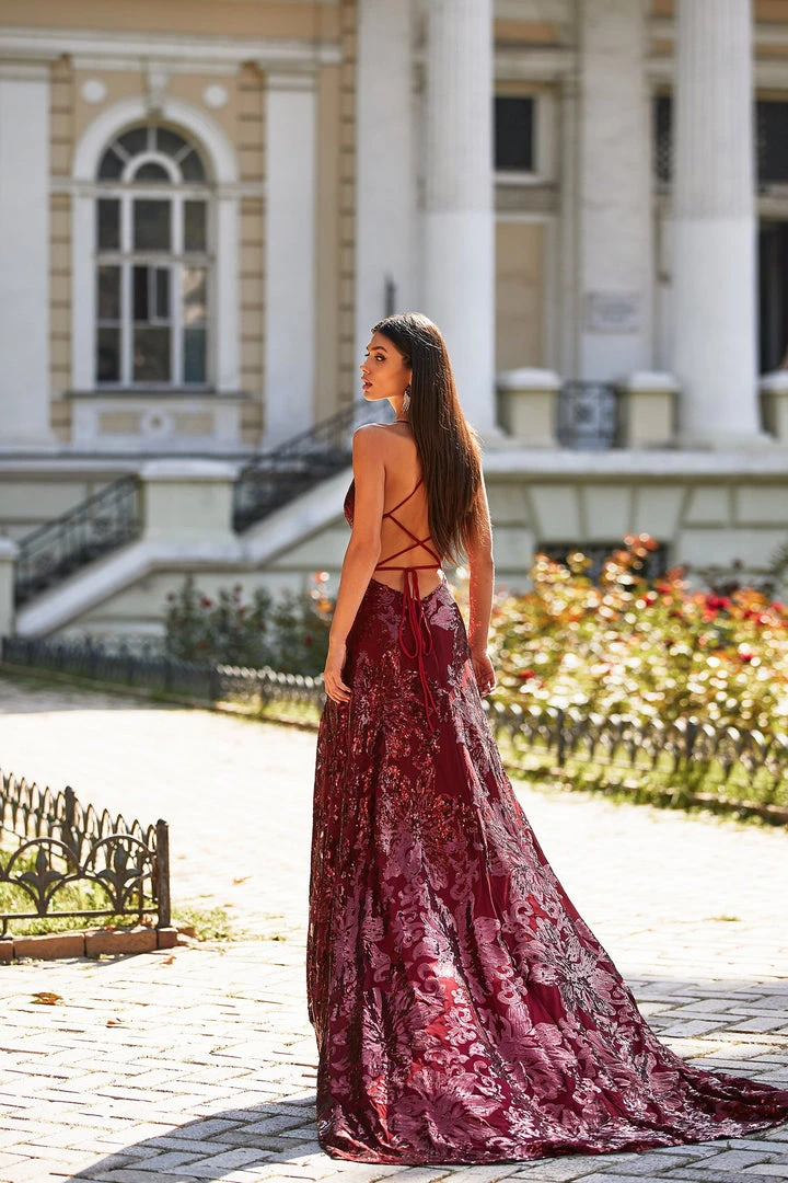 Turn heads in the Amany Sequin Gown. This stunning burgundy sequins gown features a plunge neckline, lace-up back, a-line skirt with a train & a side slit. This gown is so glamorous & shimmering, perfect for making an entrance at your next formal event.