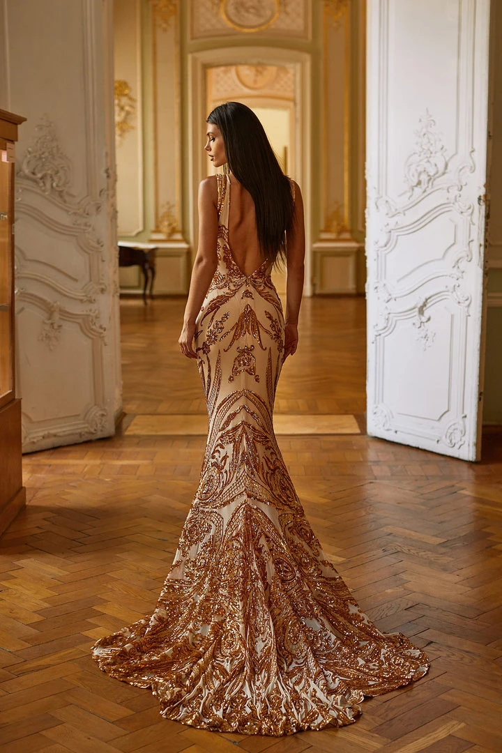 Maurita gown is the must-have prom dress. Made from new shimmering sequin fabric that hugs your figure all in the right places. It features a deep plunge neckline with an open back. The gown is fully lined.