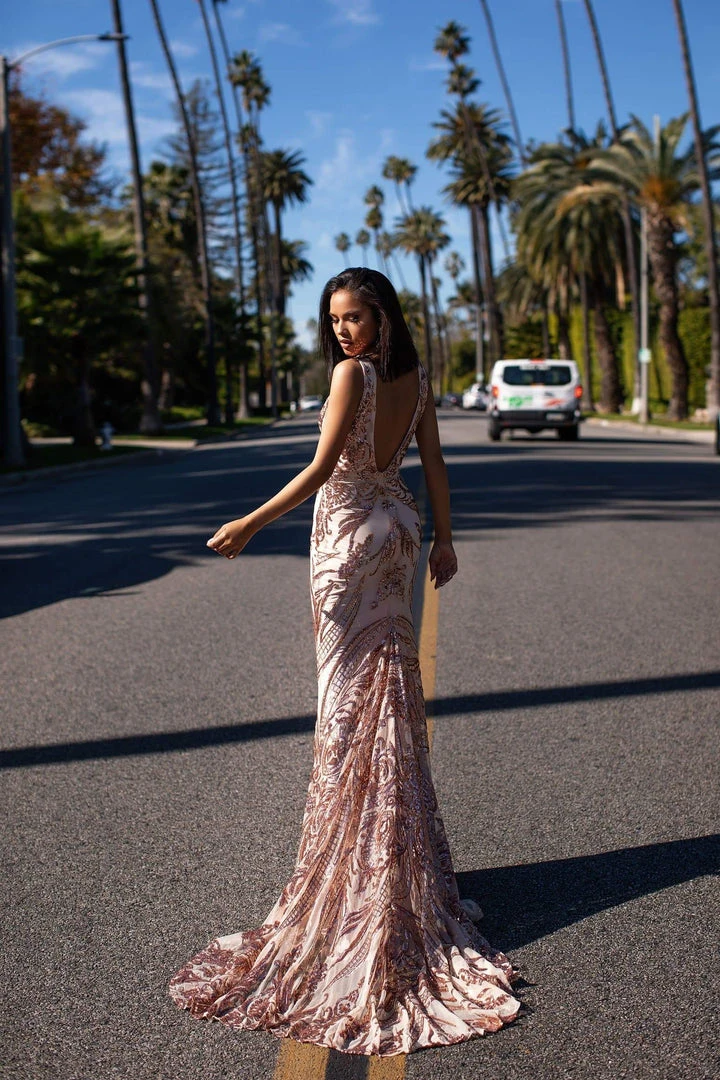 Maurita gown is the must-have prom dress. Made from new shimmering sequins fabric that hugs your figure all in the right places. It features a deep plunge neckline with an open back. The gown is fully lined and this fabric has minimal stretch. Â