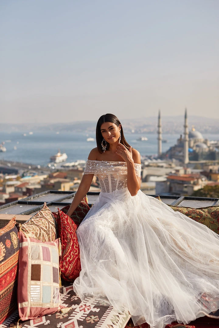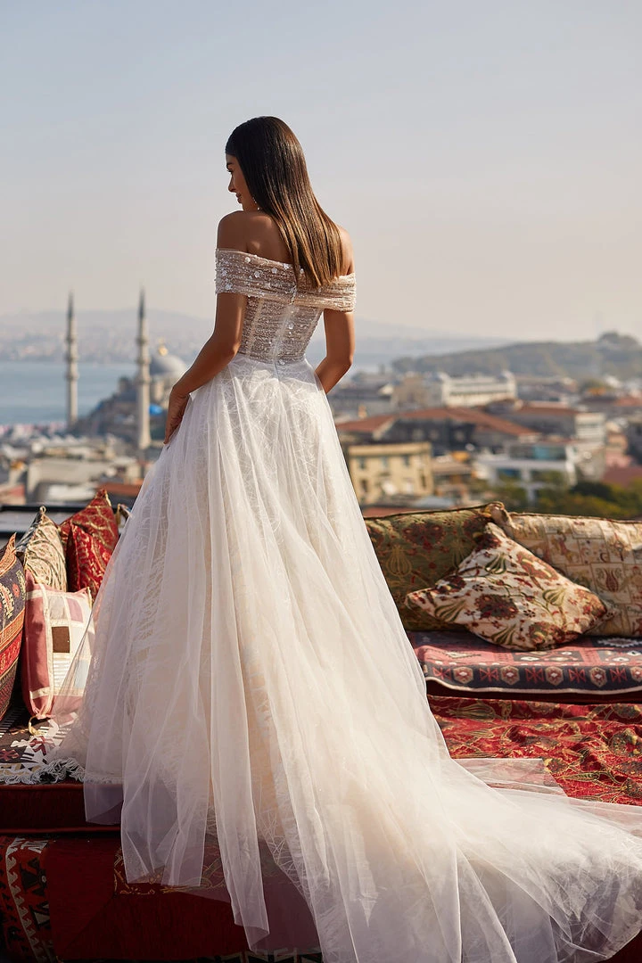 The Sibeli Gown will leave everyone fixated on the bride. Rendered from a delicate ruched beaded fabric on the bodice with small flower details. Supported with boning in the bodice and designed with a detachable arm drape for a versatile look. The lace tulle skirt adds to the overall design and embraces an element of class.