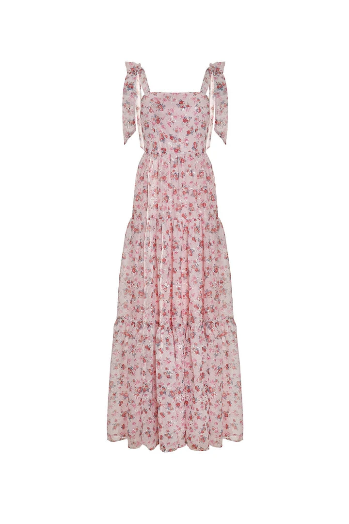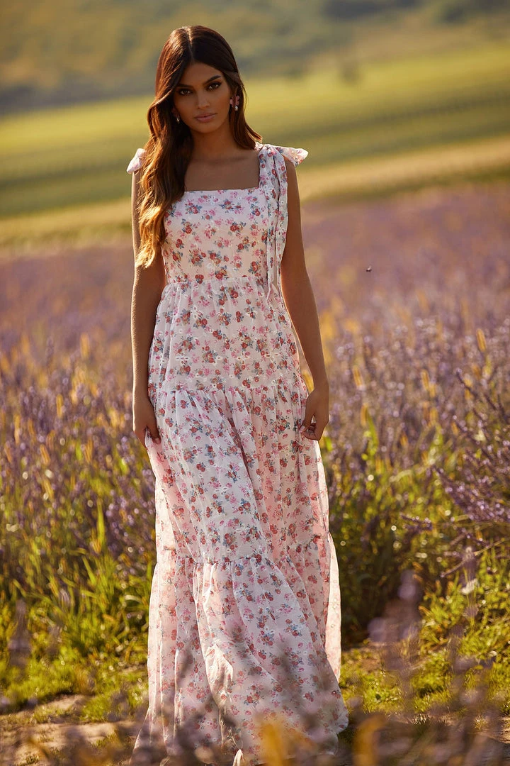 A timeless design in a modern floral fabrication to suit the new season. The Anais Dress embodies elegance with its straight neckline, a-line silhouette, and bow sleeves. Fitted at the waist and then falling to the floor, the Anais Dress is a summer dress of choice.