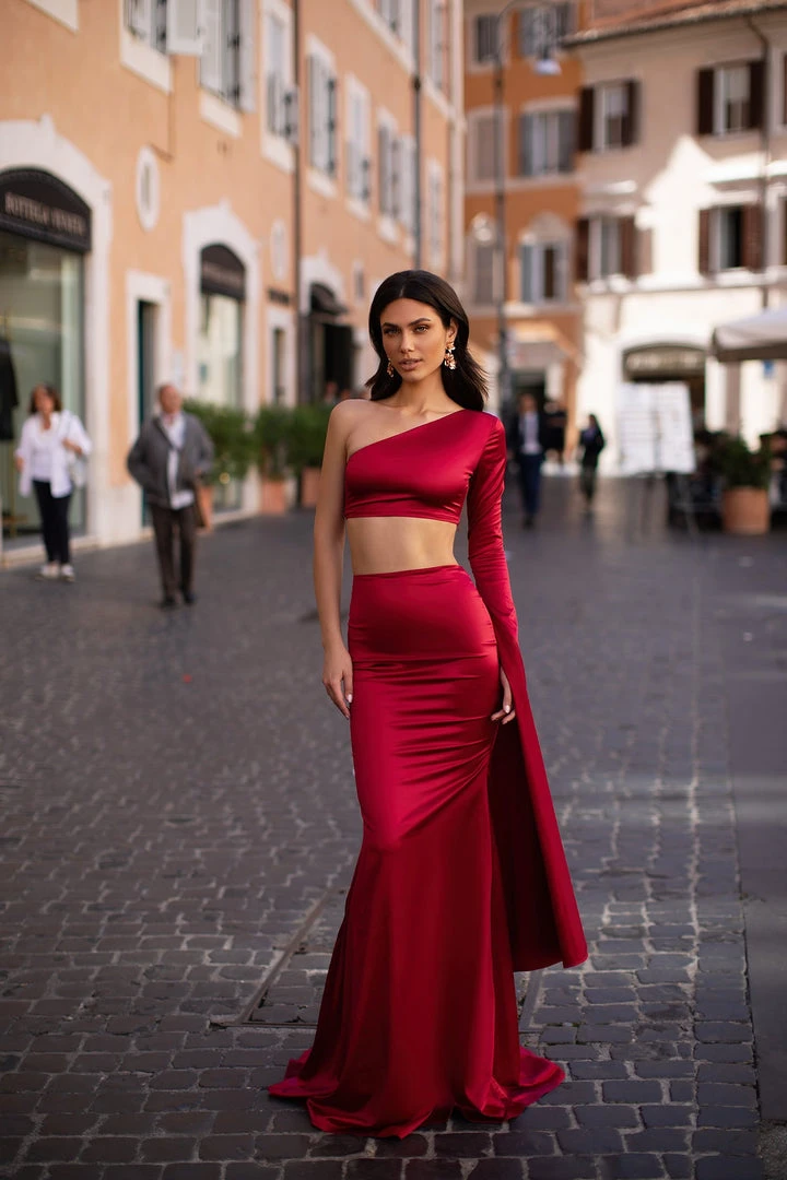 This modern two-piece design will captivate onlookers. Miya is made from silky red satin & features an asymmetrical one-shoulder long flare sleeve with ruched detailing on the back skirt.Â