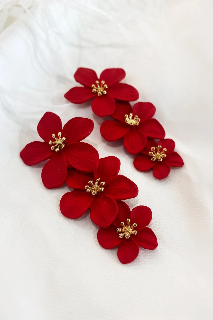 The Carola Red Multi Flower Earrings are the perfect accessory to accentuate your look. This triple flower design with gold centers is a must-have.