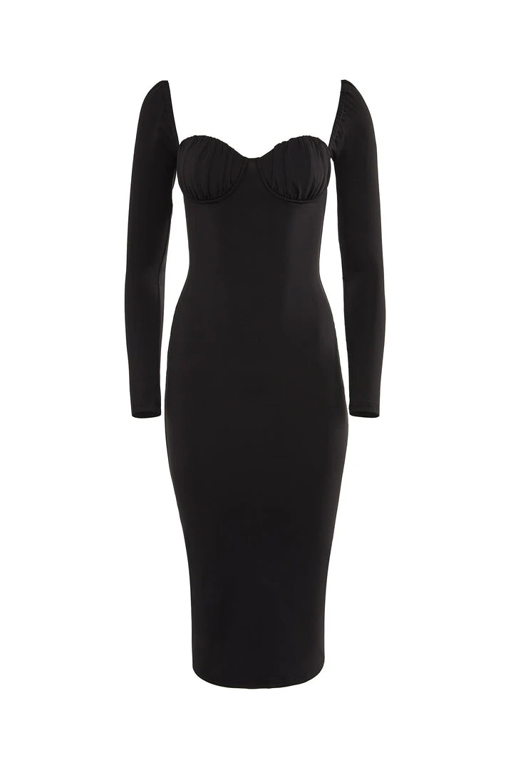 The Claude Dress will be a staple piece for your luxury events. Fixed with a figure-skimming silhouette, long sleeves, and ruched bust cups. Simple yet show-stopping, this midi dress will flatter and elongate the female form.
