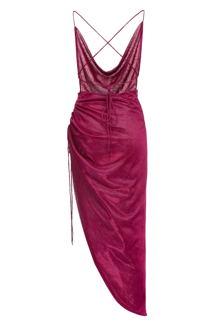 The Vallara Dress is the epitome of style. This shimmering mesh midi dress is produced from a gorgeous iridescent fuchsia fabric. It features a cowl neckline, lace-up back & an adjustable ruching side slit. Feel like a goddess when you arrive in Vallara.