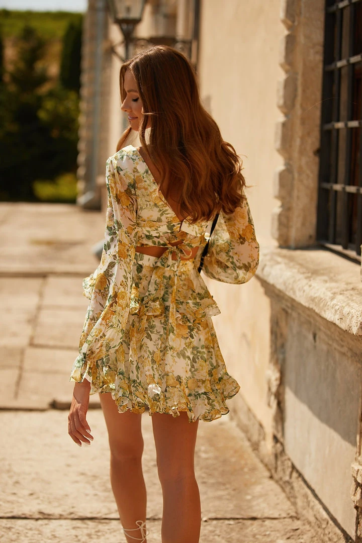 Flirty and feminine, you can’t go past this sweet floral mini dress with cut-out details and ruffle accents. Crafted from a light chiffon fabric in a vibrant hue with semi-sheer sleeves and a tie-up back. Encapsulate the essence of spring in the Fleur Cut Out Mini Dress.