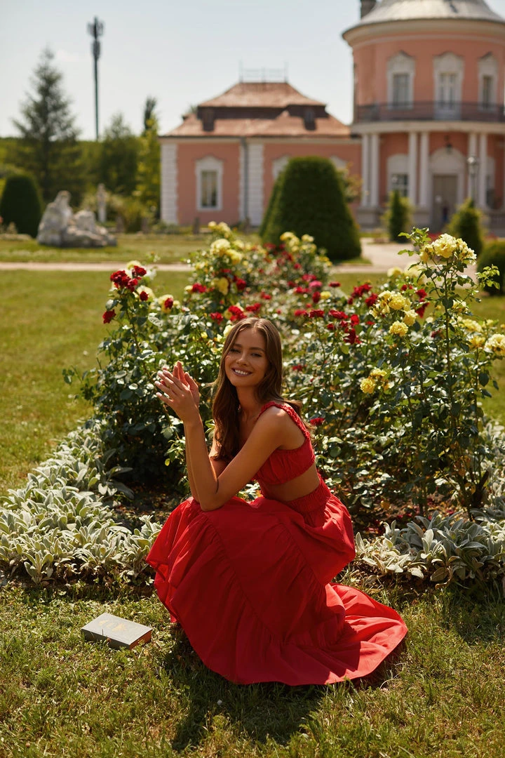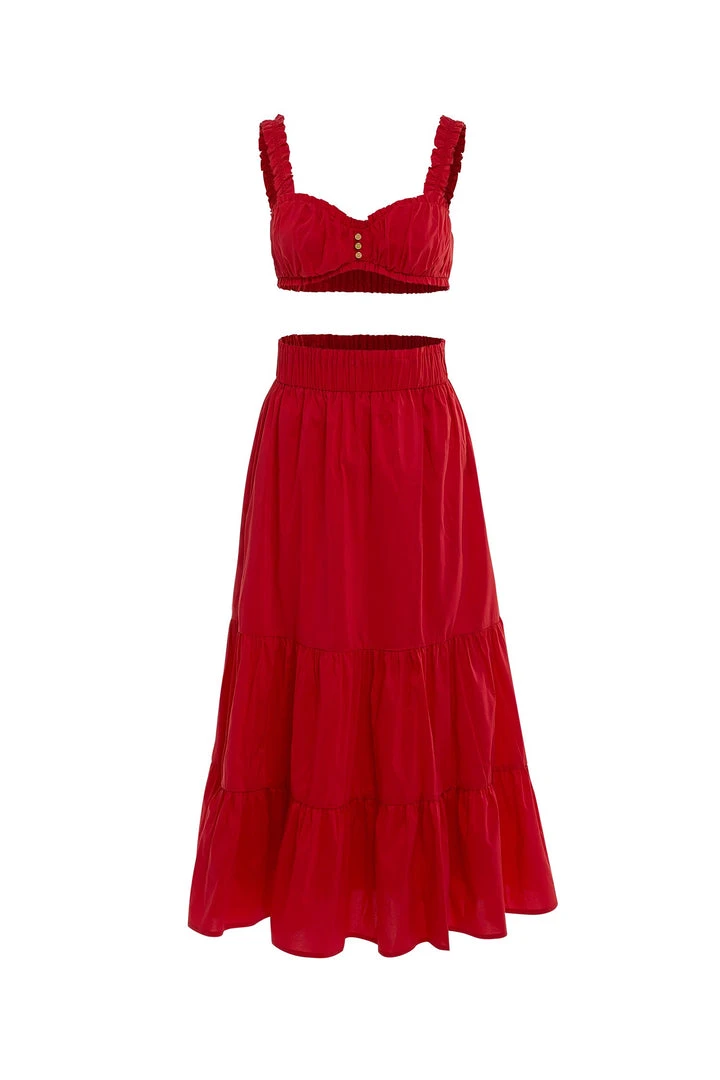 Classy and elegant, the Ember Set embraces femininity with its two-piece design, ruched bralette, and a-line skirt. Elevated with gold-toned buttons and detailed straps. Crafted from a cotton poplin fabric, this red set will upgrade your wardrobe.