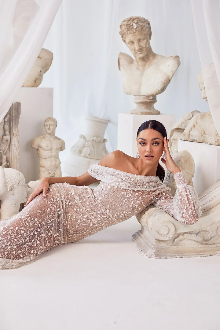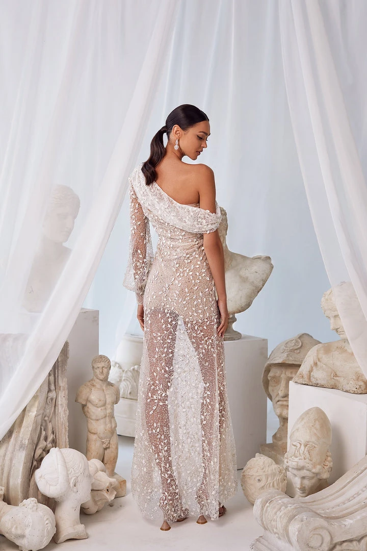 A striking style that is both captivating and feminine. The Emma Gown features a sweeping asymmetrical ruched neckline, one-shoulder balloon sleeve, and a straight silhouette. Rendered from a sheer fabric that’s embellished with super delicate beading. This gown was crafted to elevate your formal wear.Â
