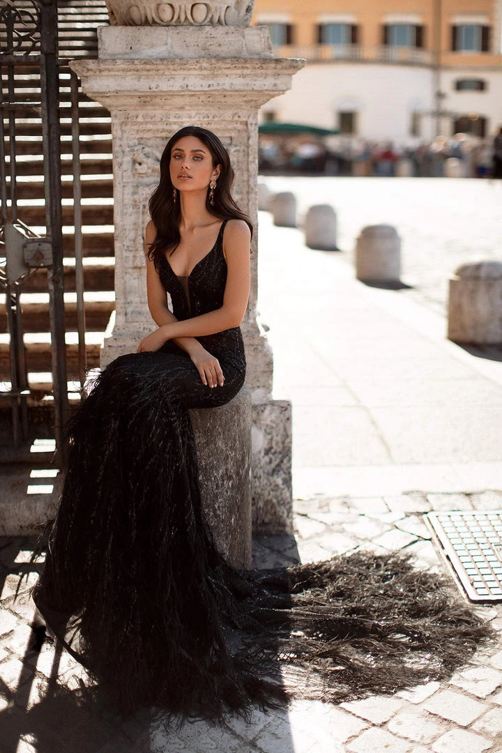 The definition of sophistication, the Filippa Gown is made from delicately shimmering patterned sequin fabric. Features the perfect v-neckline with a mesh insert, open back & mermaid train with feather details on the edges. The perfect black gown for the stylish, modern girl.Â