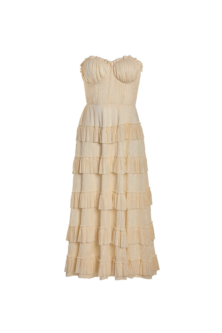 The Jacqueline Dress will be the fixture of your summer event wardrobe. Crafted from a micro-pleated fabric in an eggnog hue, this strapless midi dress is elegantly tiered down the a-line skirt and accented with frill details on the bust. The Jacqueline Dress is the perfect simplistic contemporary look.