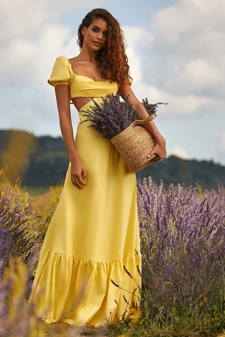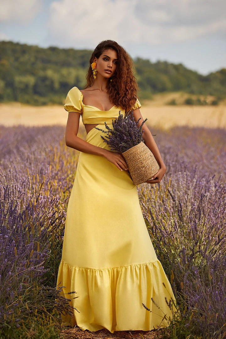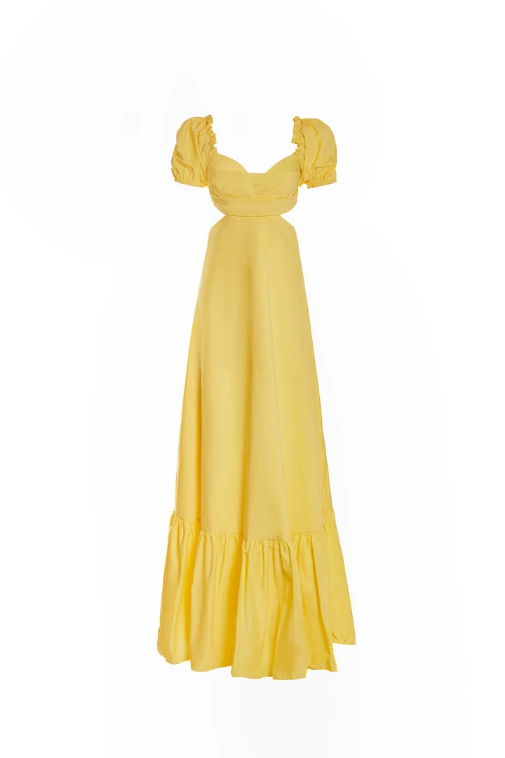 The epitome of effortless summer styling. The Kasia Dress features a bustier with tuck pleats, side cut-outs, and bow tie back. With an a-line silhouette and puff sleeves, this poplin maxi dress brings in all the attention with its bright yellow hue.