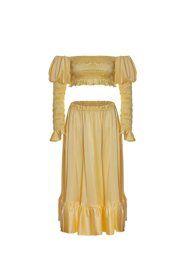 The Lola Set is bound to make an entrance no matter the event. Bright yellow in colour and soft to touch, this two-piece satin set exudes confidence with its ruched crop, long off-shoulder Juliet style sleeves and matching maxi skirt with a frill trim. This set will be perfect for both the warmer and cooler weather.