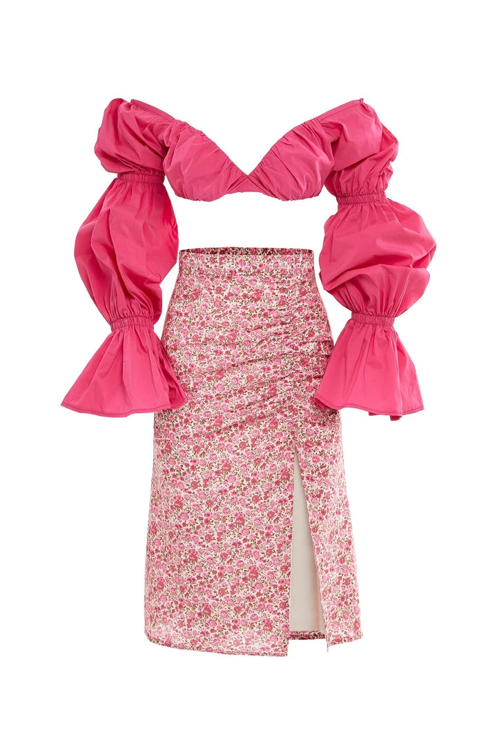 Bright and alluring, the Loulia Top was made to stand out. Ruched at the bust and flared at the sleeves, this off-shoulder crop top can be so versatile when choosing an outfit. Rendered from a structured poplin fabric, this hot pink crop will be your new favorite piece. Pictured with the skirt from the Melina Set.Â