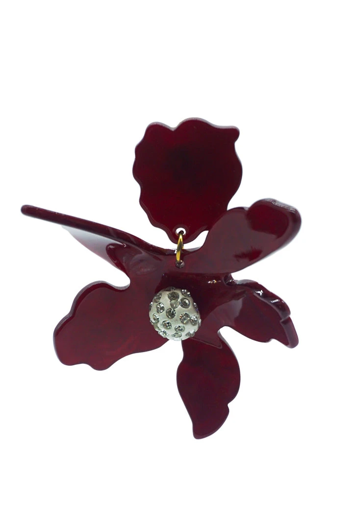 If you love a good statement earring, the Luna Burgundy Flower Earrings are perfect for you! Featuring gold hardware with a burgundy acrylic flower and tiny sparkling diamanté detailing in the center.Â