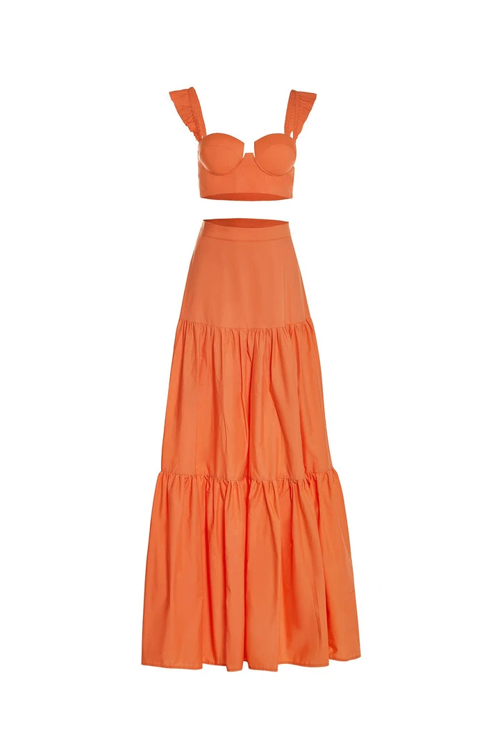 In a vibrant orange hue, the Celia Set leans into the field of dream aesthetic. The Celia Set bares an a-line silhouette with a frill sleeve and modern bust cut out. Opt for a stand-out look at your next event in the Celia Set.