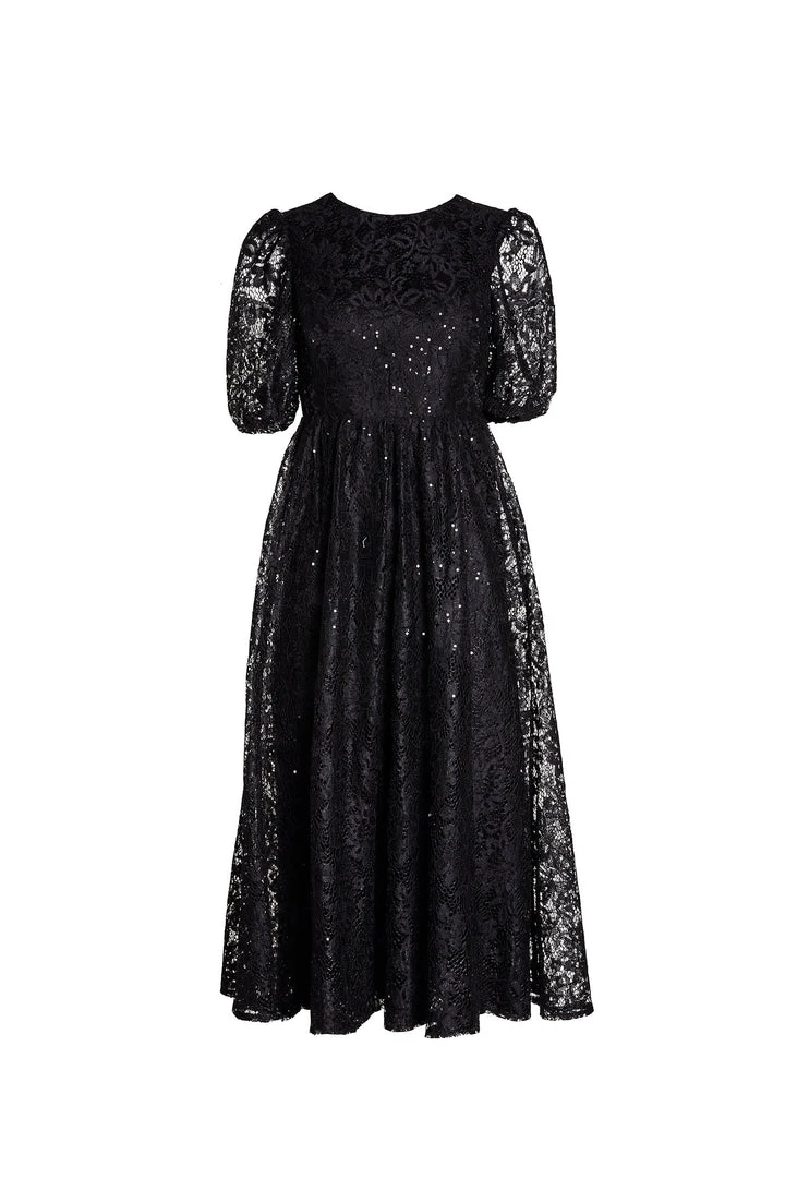 Timeless elegance meets chic glamour in the Manon Dress. Embellished with sequins, this black lace midi dress features a high neckline with semi-sheer peasant sleeves. Bringing a more contemporary appeal, the Manon Dress is elevated with its open, lace-up back. Fitted at the waist and the skirt falls effortlessly to below the knee