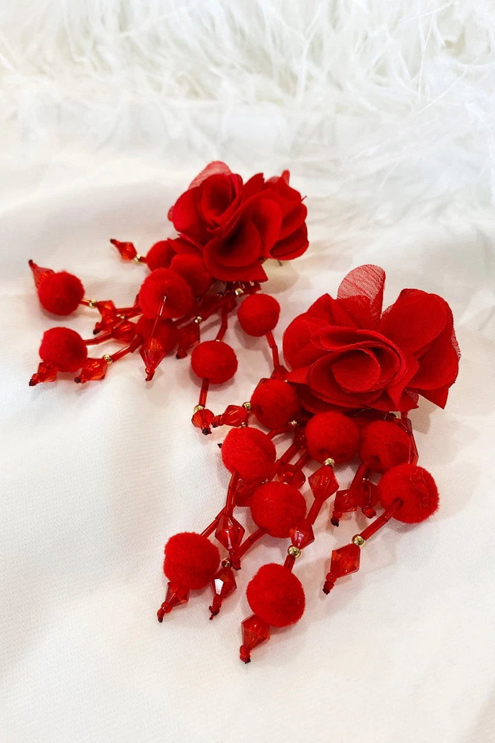 The Shailee Red Flower Drop Earrings are one of many new additions to our earring collection. Embellished with mini beads and statement flowers, these earrings will be sure to make a statement.Â