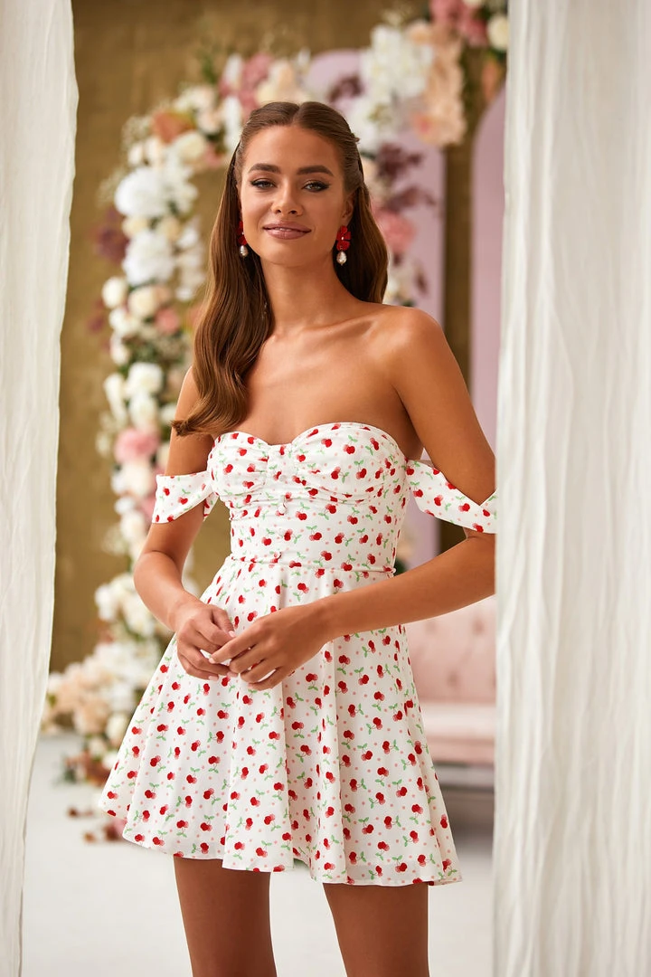 SKU: 6578187665583 Categories: A-Line Dresses, DRESSES, Mini Dresses, SALE Tags: A-line, Lace-up back, Mini, Off-shoulder, Print, Sweetheart neckline, White