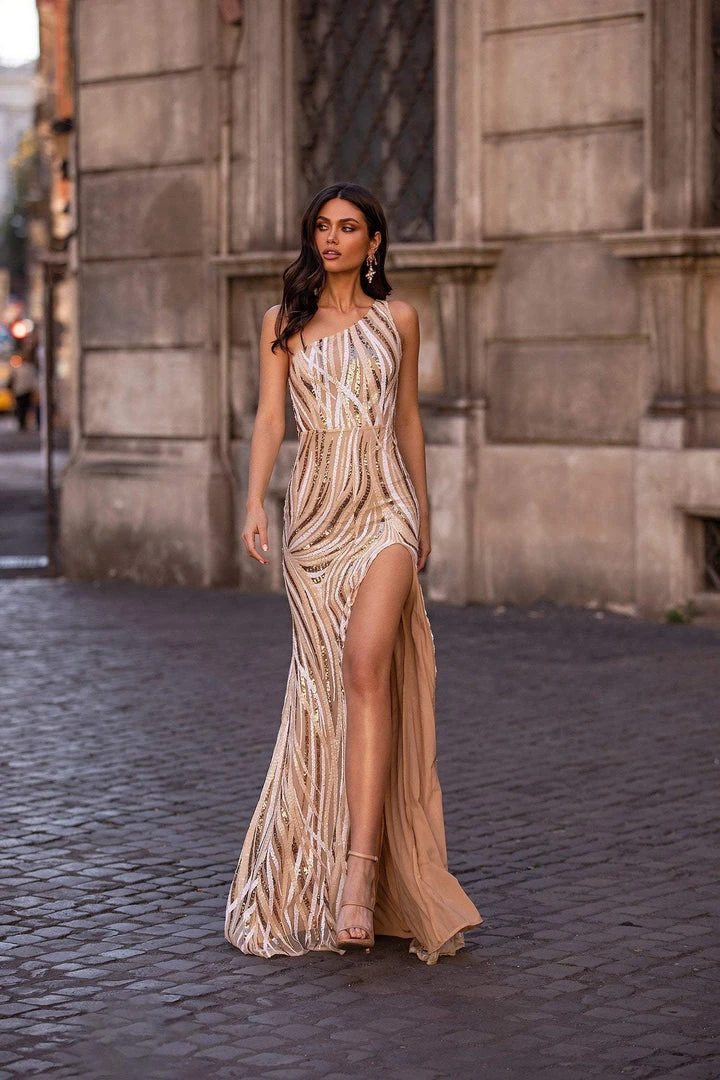 Elegant & classy, the Pauletta gown is an on-point one-shoulder gown made from nude fabric & covered in a gorgeous sequin pattern (White & Gold). Features a side slit, mermaid train & figure-hugging silhouette to make you look your best.