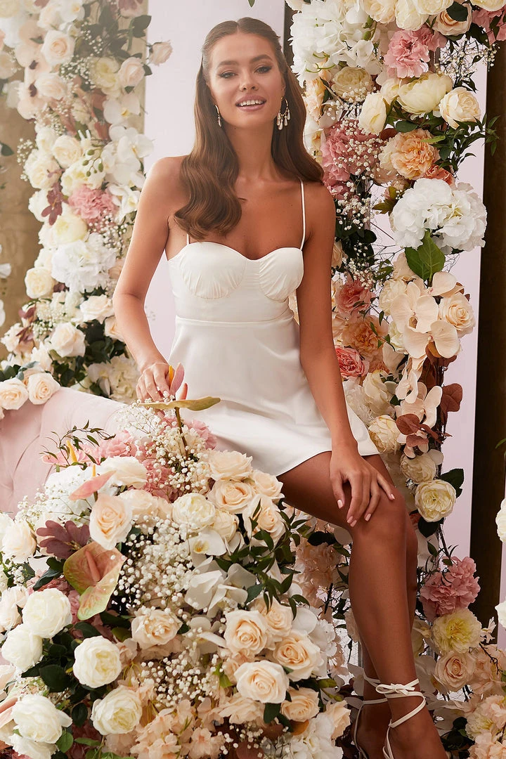 The Positano Dress is a stunning white satin a-line mini dress. Features delicate thin straps, an in-built bustier & lace-up back with a flattering a-line fit. This little white dress belongs in every girl’s wardrobe. So versatile – wear it to date night or a picnic with the girls.Â
