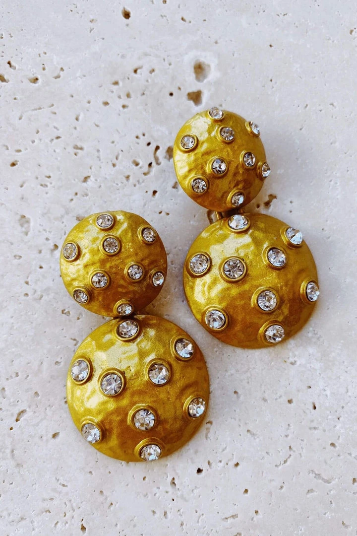The perfect twist on modern simplicity, the Qiana gold circle crystal earrings add a touch of class and detail to your gown. Made from stylish gold hardware, these earrings will complete almost any gown perfectly.