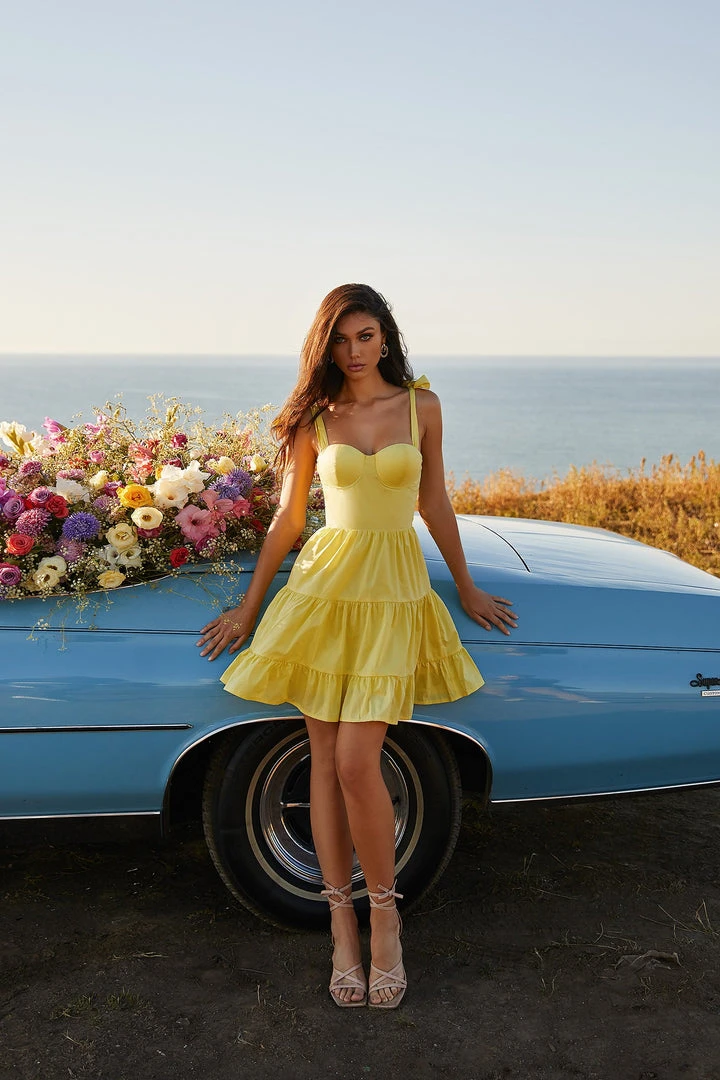 The Nalani Dress is the dreamiest little yellow dress. Features an a-line silhouette with built-in bustier, tie-up straps &Â is made from sunshine yellow fabric. The perfect day dress.