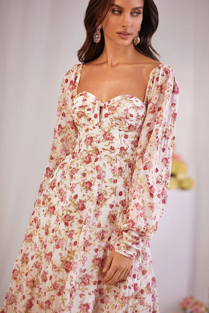 Our feminine outlook is materialized with the Serafina Midi Dress. Crafted from an embroidered floral fabric and elevated with its semi-sheer bishop sleeves, structured bodice, and a-line silhouette. The Serafina Dress is highlighted with our favourite lace-up back design, so romantic.