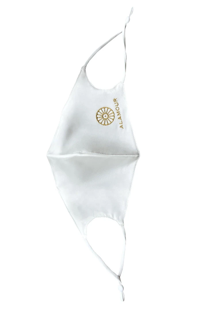 100% Mulberry Silk face mask to keep you stylish & safe. Features two silk layers, an adjustable nose wire, adjustable straps, 2x removable filters and a shimmering gold embellished logo.