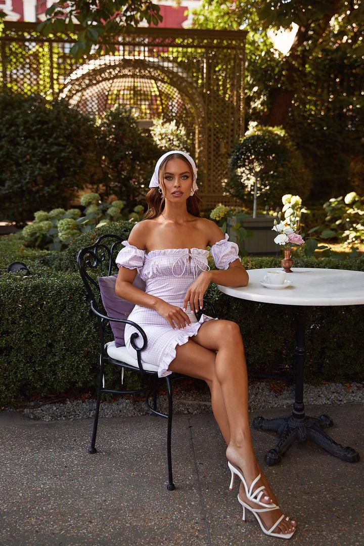 Feel cute in the Suzeta dress. This mini lilac gingham print dress features frilly bust details, off-shoulder sleeves and a more fitted look. Comes with an adorable matching head scarf.Â