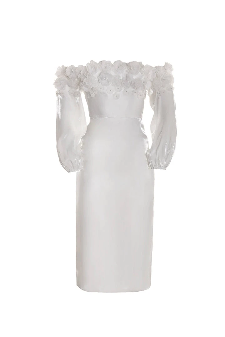 White shimmery organza fabric with floral appliques, no stretch, lined with satin, off-shoulder sleeves, semi-sheer sleeves, pearl appliques