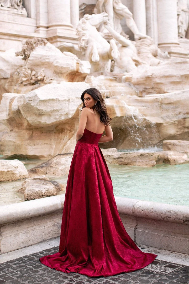 Effortlessly gorgeous & flattering for every girl, the Terina Gown features a stunning a-line skirt with a slit, stylish strapless v-neck bustier & is made from beautiful jacquard fabric. Feel like a celebrity at your special event in Terina.