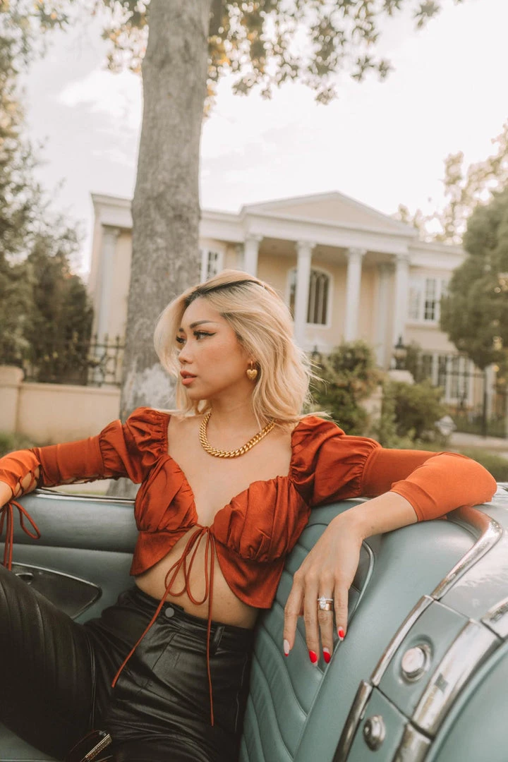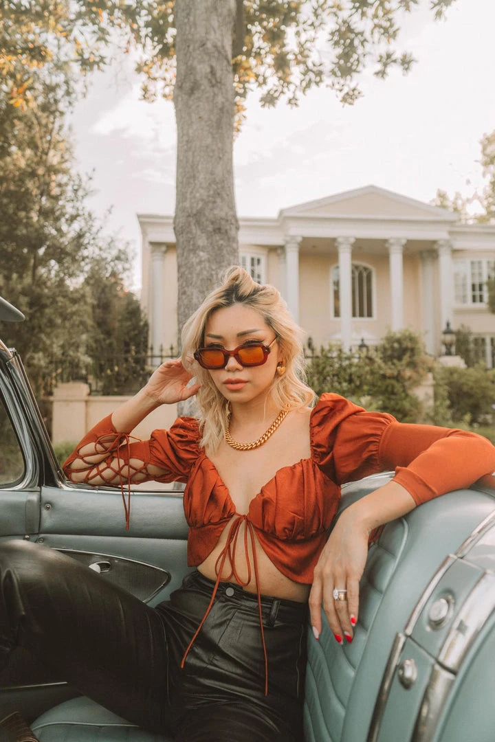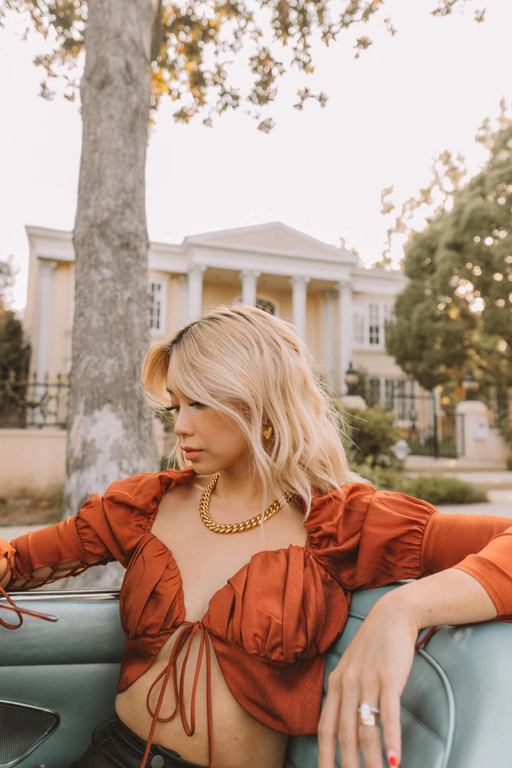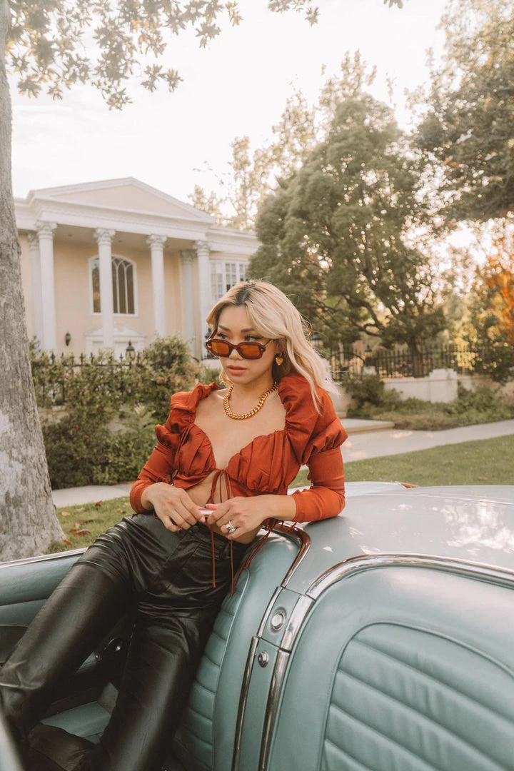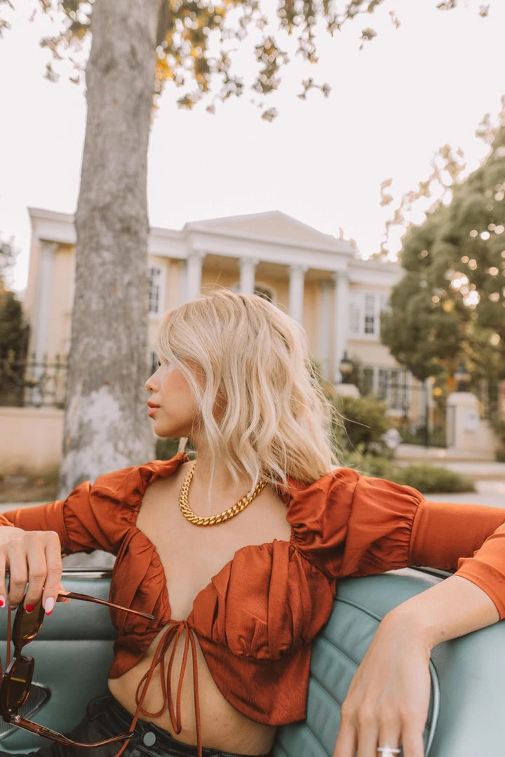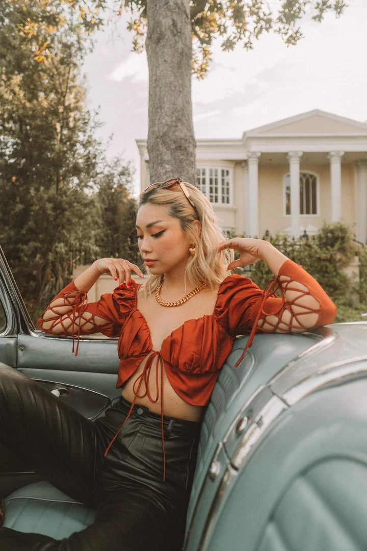 So luxe and on-trend! The Rafael Crop is the hottest new style. Featuring puff sleeves with lace-up detailing, a ruched back, and a tie front. Made from textured rust satin, the Rafael is the perfect addition to your wardrobe.Â
