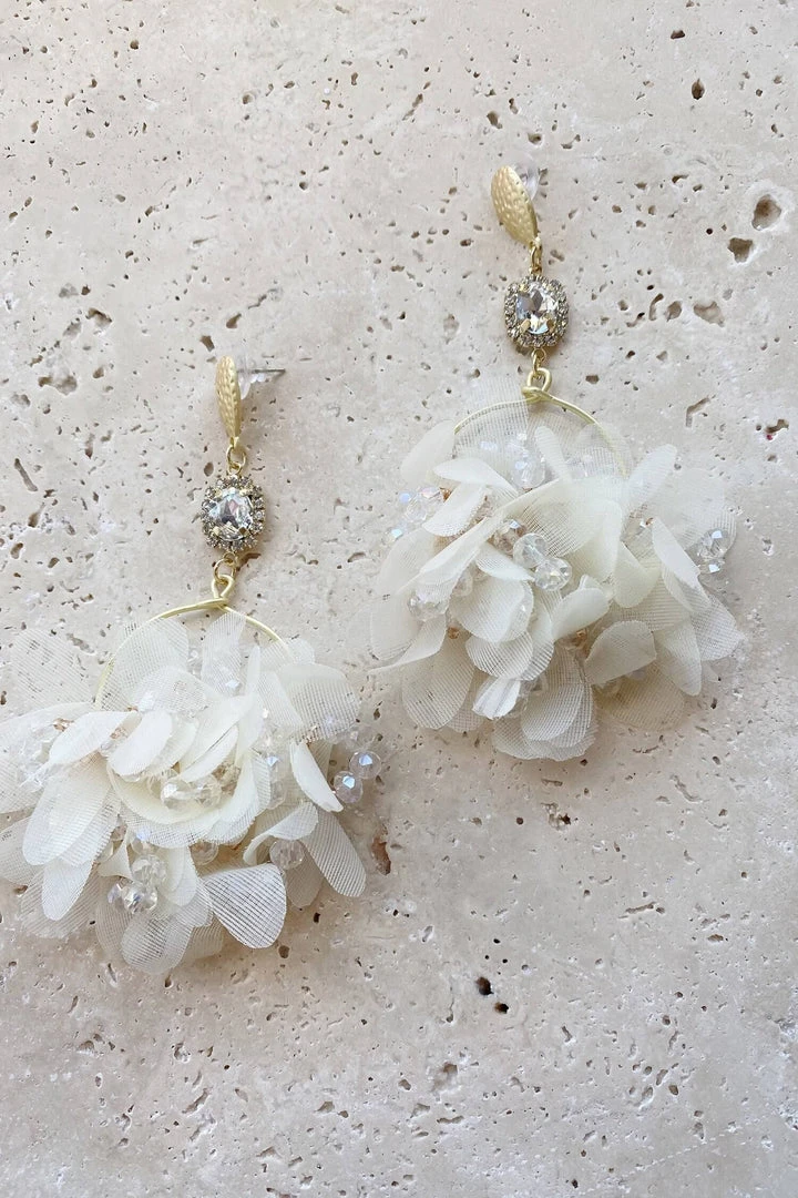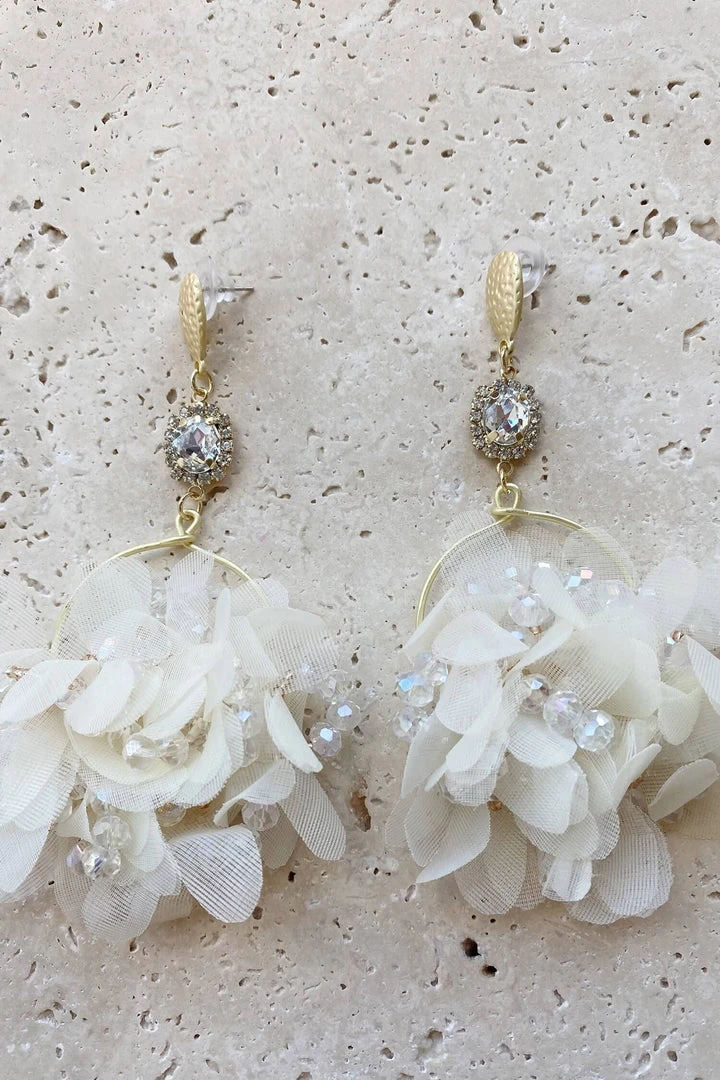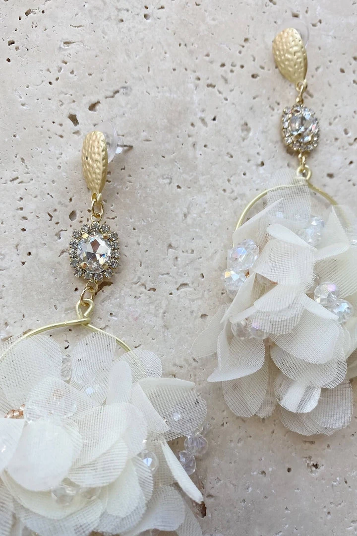 The Verbana White Flower Hoop Earrings are a must-have statement piece. Featuring a white flower centerpiece and diamante embelishments. Â